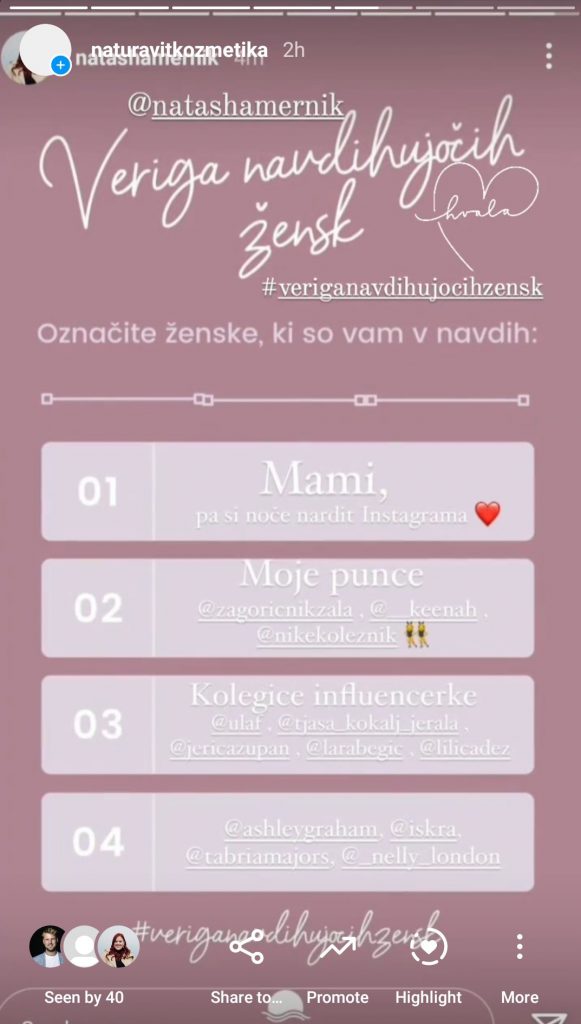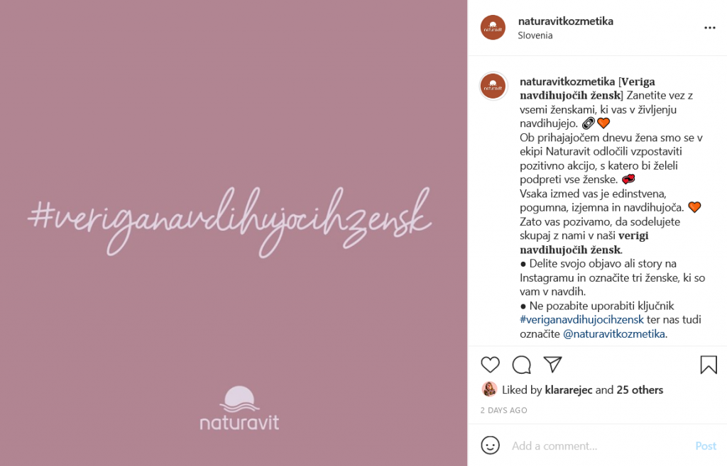 V prvem tednu marca smo na našem Instagram profilu (@naturavitkozmetika) pričeli z malce drugačno akcijo, katere namen je bil vzpostaviti verigo med edinstvenimi ženskami, ki nas navdihujejo vsak dan.